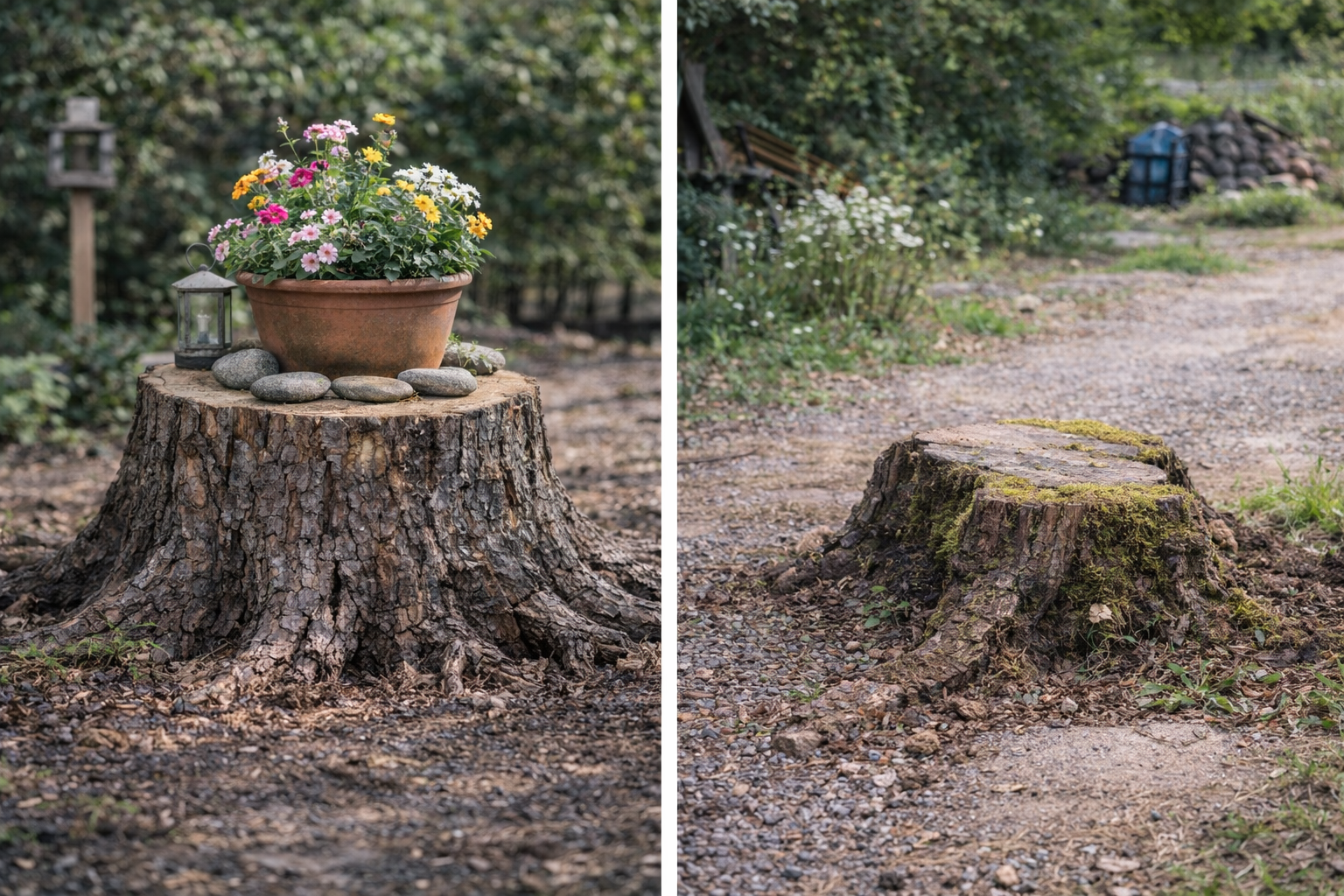例えば庭の一角にあった木を切って、しばらくは花壇や砂利敷きとして使うだけなら、伐採後に切り株を枯らす処理を施す方法でも対応できます。