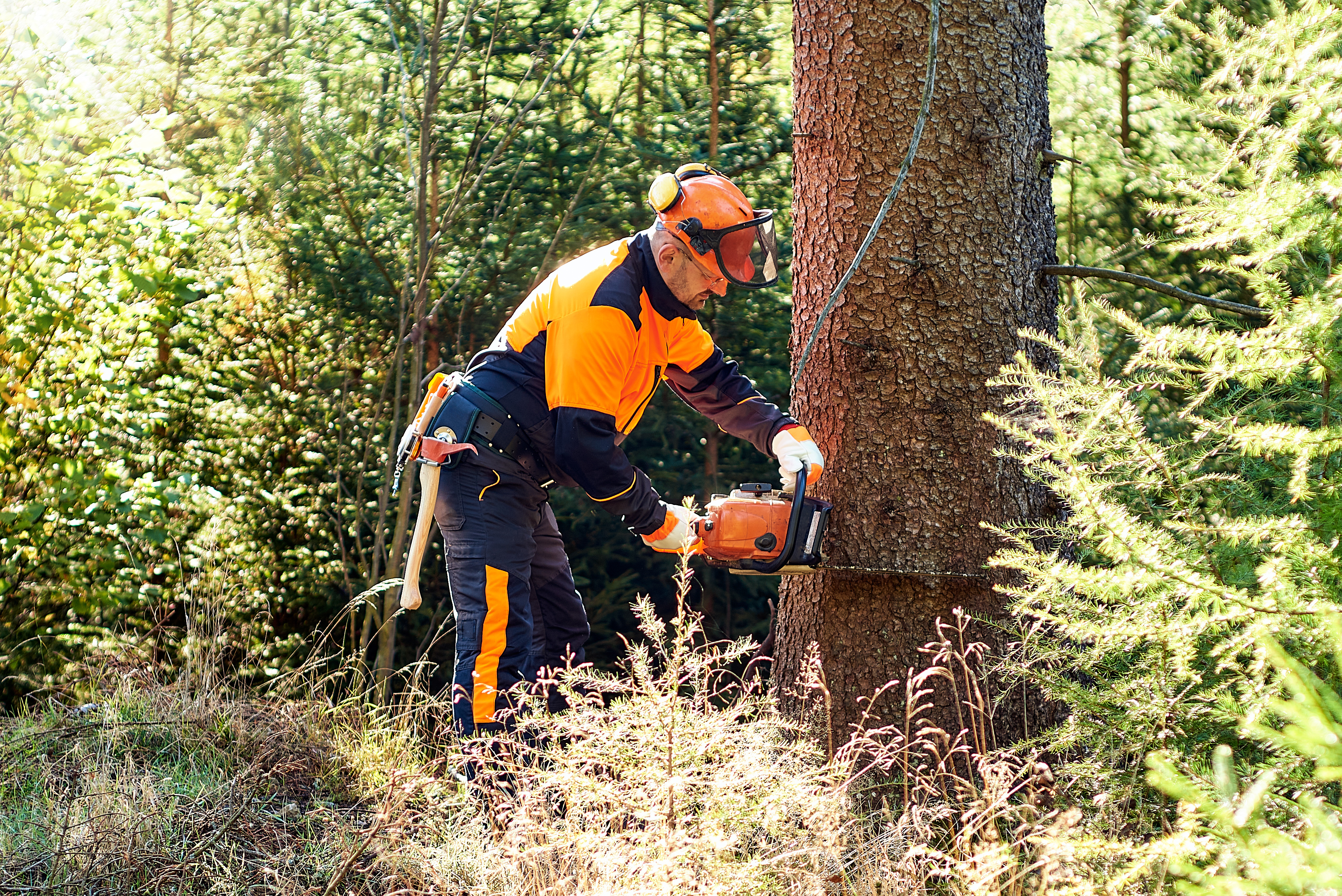 伐採では、受け口と呼ばれる切り込みを倒したい方向に入れ、追い口を反対側に入れて、木が想定した方向に倒れるよう調整します。