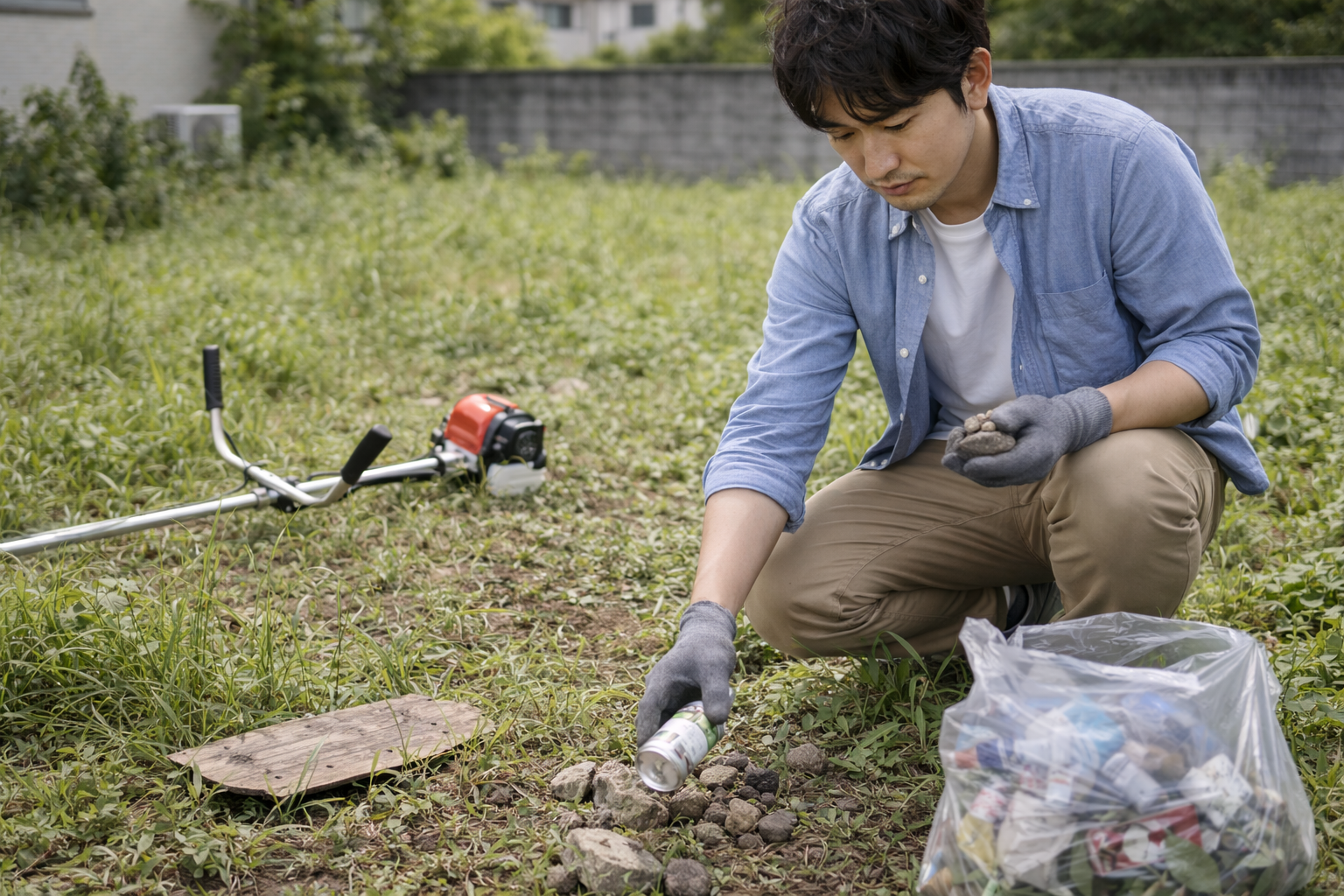 特に空き地や長期間放置された土地では、空き缶や木片・石などが散乱しているケースがあります。