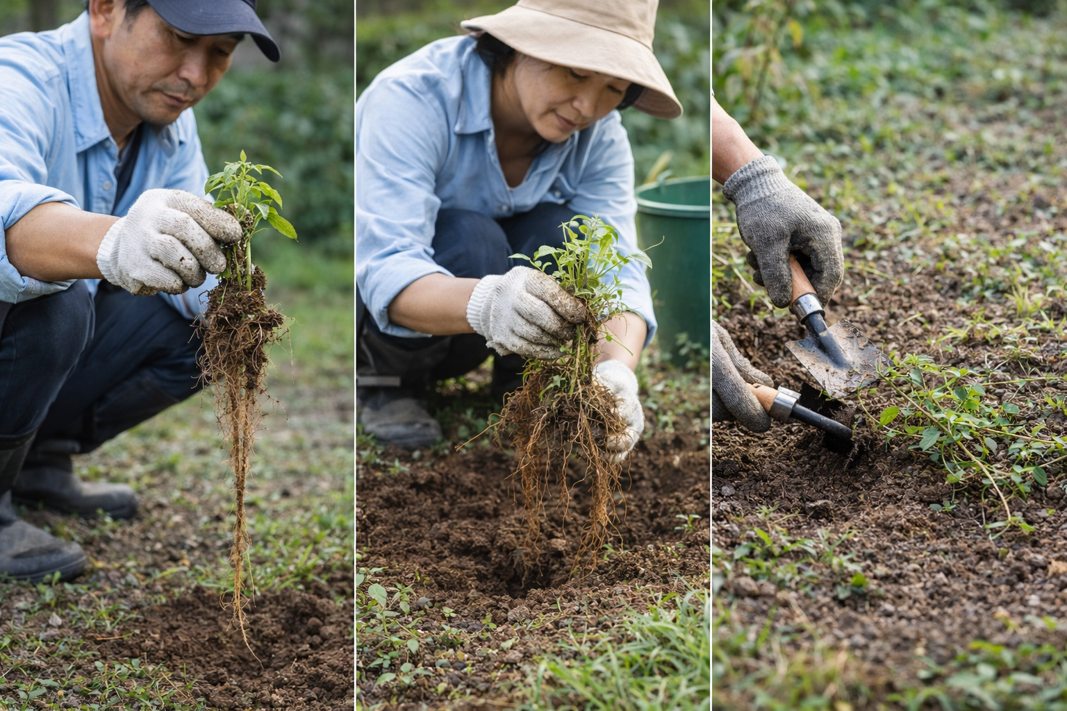 草むしりの際は、茎の根元をしっかり持ち、真上に引き抜く意識を持ちましょう。斜めに引っ張ると、途中で根が切れてしまい、再生の原因になります。