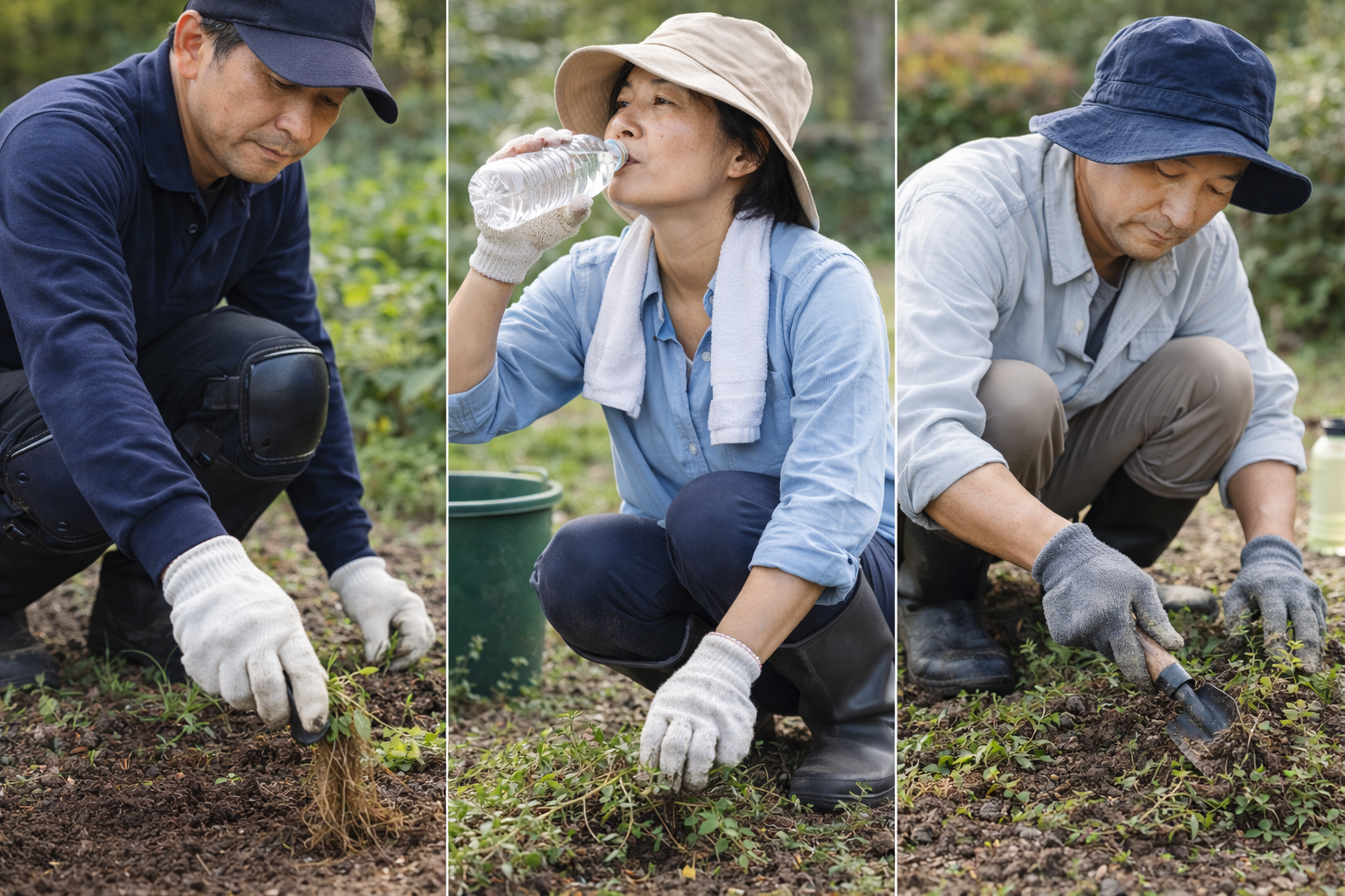 草むしりは屋外で行う作業のため、気温や日差しの影響を強く受けます。特に夏場や梅雨明けの時期は、短時間の作業でも体温が上昇しやすく、熱中症のリスクも。そのため帽子の着用とこまめな水分補給は欠かせない準備といえます。