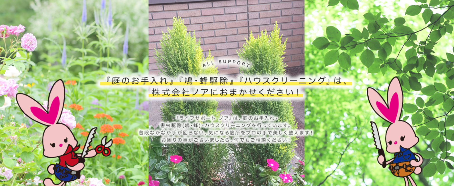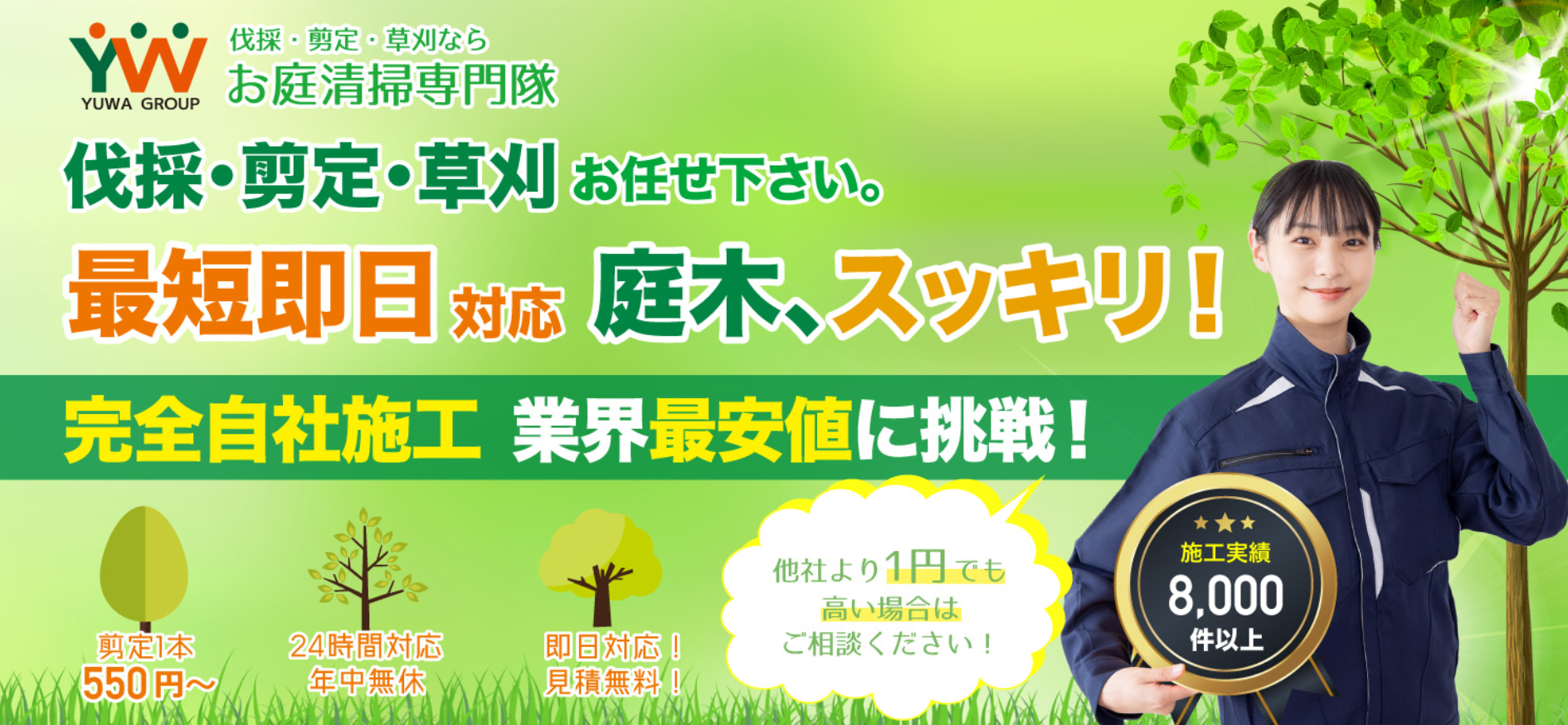 | その他サービス | 草刈り、草むしり、庭木の剪定、伐採、防草シート施工、除草剤散布、芝刈り、植栽、植木の消毒、植え込み刈込など |